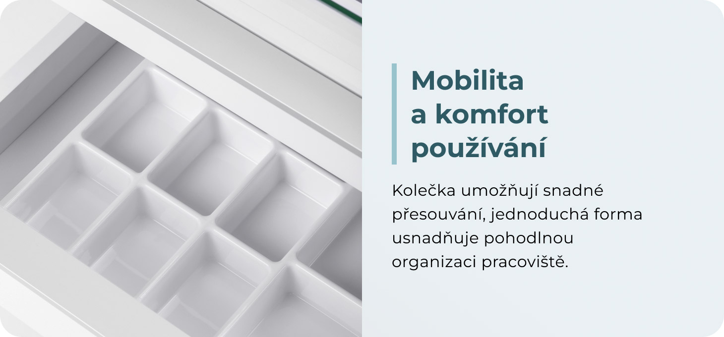 Praktická kolečka usnadňují snadný pohyb skříňky v ordinaci. Jednoduchá, minimalistická forma v bílé barvě dodává nábytku univerzální, profesionální vzhled, který dobře zapadá do moderních interiérů. Konstrukce navržená s ohledem na profesionály v oboru podologie poskytuje vyhrazené místo pro podologickou frézu a nezbytné příslušenství, což přispívá k pohodlné a ergonomické práci během zákroků.