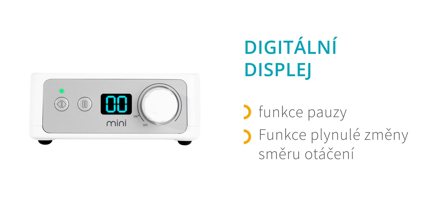 Bruska na nehty je vybavena přehledným ovládacím panelem s digitálním displejem, který hraje klíčovou roli při sledování a řízení provozu stroje. Displej zobrazuje rychlost, s jakou aktuálně pracuje hlava jednotky, a zajišťuje tak přesný a bezpečný provoz frézky. Nastavení rychlosti pomocí voliče je možné až do 30 000 otáček za minutu, což umožňuje přizpůsobení, a tedy pohodlné provádění široké škály ošetření. Systém plynulé změny směru otáčení s integrovanou pauzou zajišťuje bezpečný a pohodlný přechod mezi oběma směry práce. Kromě toho se LED dioda směru otáčení rozsvítí zeleně nebo červeně, což usnadňuje identifikaci směru frézy. Ovládací panel je rovněž vybaven funkcí pauzy, která umožňuje uživateli zastavit provoz stroje a získat tak větší kontrolu nad procesem. Díky použitým řešením je ovládání frézky intuitivní a velmi efektivní.