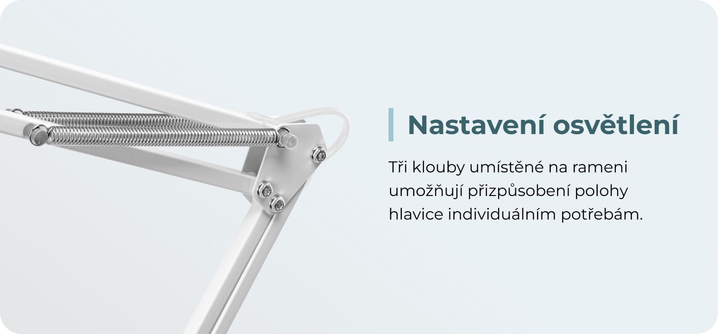 Lampa nabízí nastavitelný úhel dopadu světla, což umožňuje přesné osvětlení pracovního prostoru. Díky možnosti montáže na pracovní nebo ošetřovací stůl šetří lampa cenný prostor tím, že poskytuje pohodlí. Značný potenciál, který nabízejí pohyblivé části stativu a u hlavy lampy, umožňuje libovolně nastavit osvětlení pracovního prostoru podle prováděného postupu. Tři klouby s širokým rozsahem pohybu, umístěné na rameni, umožňují snadné nastavení a přizpůsobení polohy hlavy.