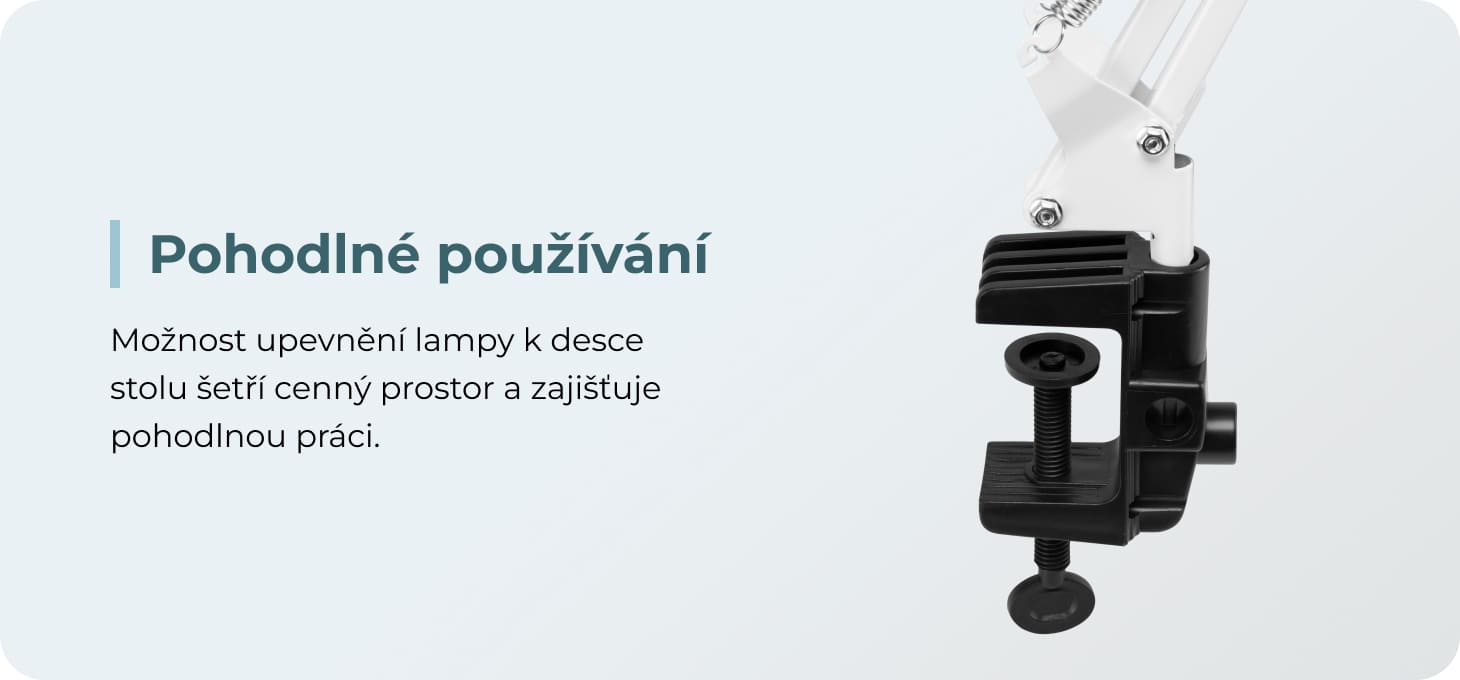 Svítidlo lze snadno připevnit na desku stolu díky držáku fungujícímu na principu svěráku. Maximální otvor držáku je 5 cm, což umožňuje jeho umístění na většinu pracovních ploch. Možnost namontovat lampu v různých polohách stativu poskytuje velkou flexibilitu a umožňuje přesné umístění lampy. Díky tomu lampa nabízí široké možnosti personalizace, což umožňuje přizpůsobit osvětlení individuálním potřebám uživatele.