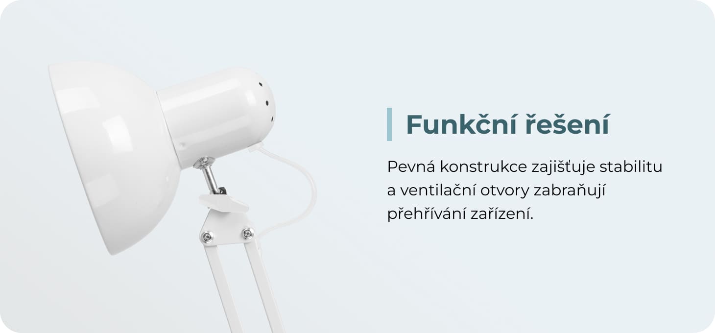 Stativ v klasickém bílém odstínu a leštěná povrchová úprava dodávají lampě elegantní vzhled, který se dobře hodí do každého interiéru. Robustní konstrukce zajišťuje stabilitu při každodenním používání, takže lampa je spolehlivým nástrojem v každé kanceláři. Větrací otvory umístěné v horní části zabraňují přehřátí přístroje a zároveň minimalizují viditelnost prachu, což usnadňuje udržování lampy v čistotě.