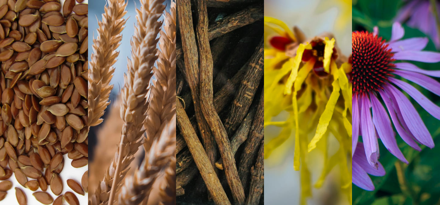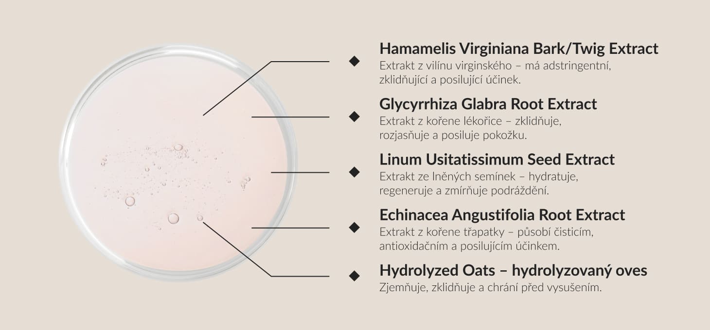 Výtažek z vilínu má stahující a regenerační účinky a podporuje přirozené funkce pleti. Lékořice a lněné semínko zklidňují podráždění, rozjasňují pleť a pomáhají udržovat hladinu vlhkosti. Třapatka má čisticí a antiradikální účinek a posiluje ochrannou bariéru pleti.