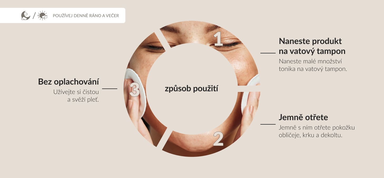Naneste malé množství tonika na vatový tampon a jemně jím otřete obličej, krk a dekolt. Používejte denně ráno a večer nebo podle individuálních potřeb pleti.