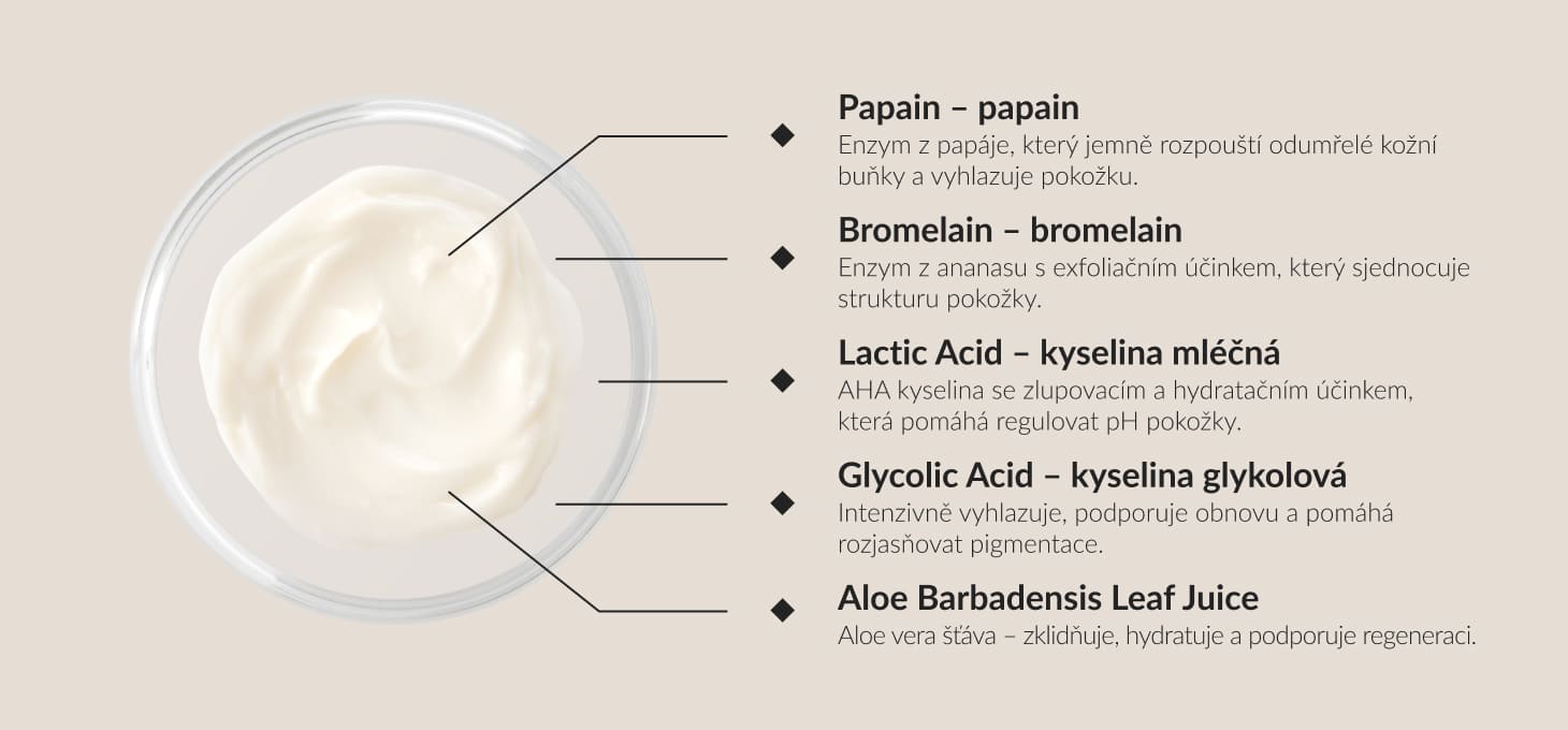 Enzym z papáji, jemně rozpouští odumřelé kožní buňky a vyhlazuje pleť.