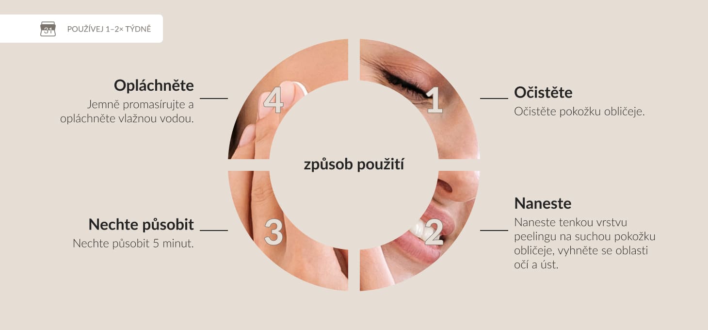 Nechte působit 5 minut, poté jemně vmasírujte a důkladně smyjte vlažnou vodou. Používejte 1-2krát týdně nebo podle potřeby pleti.