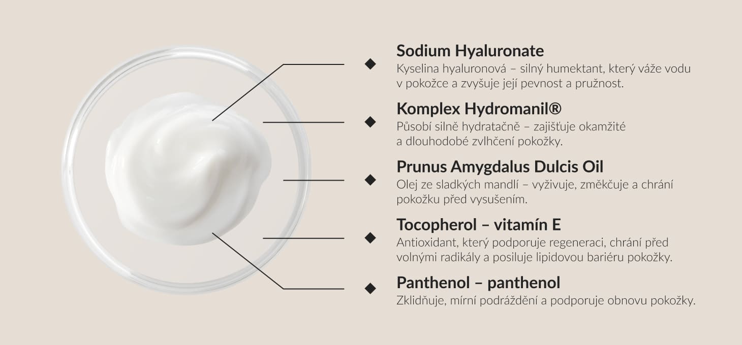 Složení (INCI): Aqua, Sodium Polyacrylate, Caprylic/Capric Triglyceride, Glycerin, Ethylhexyl Cocoate, Propylene Glycol, Saccharide Isomerate, Prunus Amygdalus Dulcis Oil, Phenoxyethanol, Sodium Hyaluronate, Panthenol, Lactic Acid, Hydrolyzed Caesalpinia Spinosa Gum, Caesalpinia Spinosa Gum, Olus Oil, Tokoferol, PPG-3 Benzyl Ether Myristate, Polysorbate 20, Citric Acid, Sodium Citrate, Ethylhexylglycerin, Sodium Benzoate, Potassium Sorbate, Parfum, Tetramethyl Acetyl Acetahydronaphthalenes, Hexamethylindanopyran, Limonene.