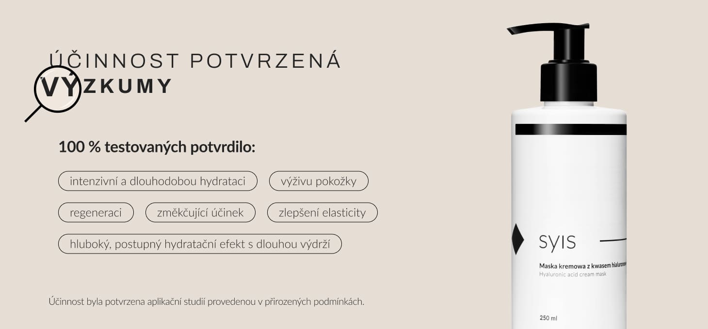 Složení krémové masky SYIS s kyselinou hyaluronovou bylo vyvinuto pro dehydratovanou, suchou a nedostatečně pružnou pleť. Je ideální pro profesionální i domácí péči - intenzivně a dlouhodobě hydratuje, obnovuje pružnost a podporuje regeneraci.