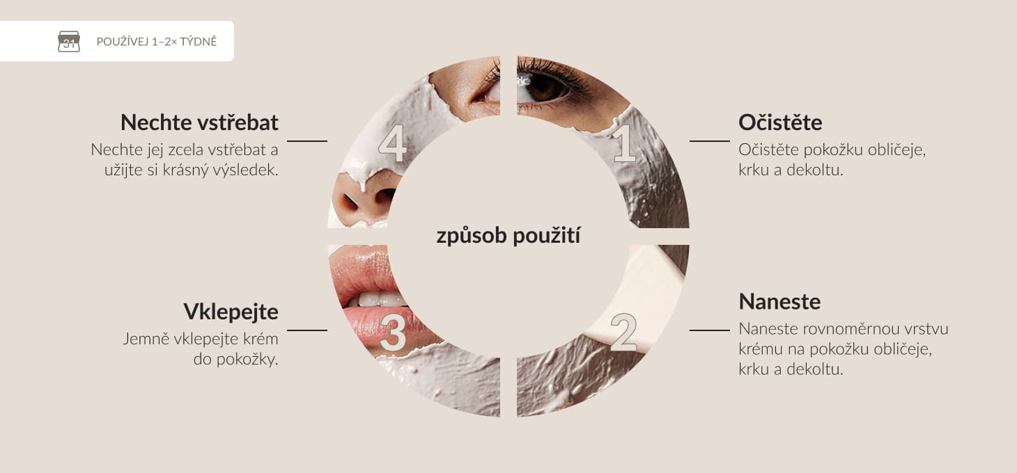 Naneste rovnoměrnou tenkou vrstvu masky na vyčištěnou pleť obličeje, vyhněte se oblasti očí a rtů. Nechte působit 10-15 minut, poté smyjte vlažnou vodou. Používejte 1-2krát týdně nebo podle individuálních potřeb pleti.