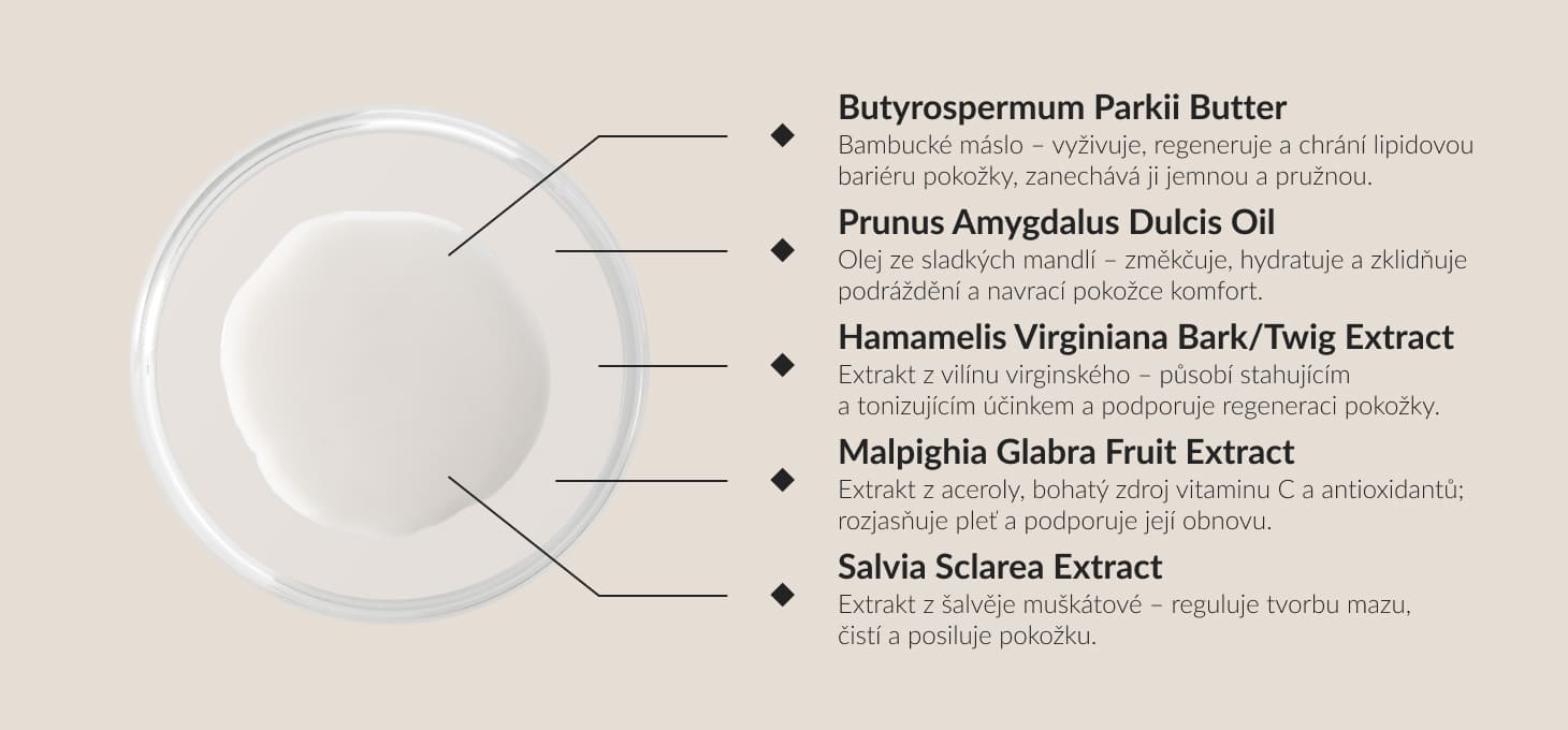 Bohaté složení na bambuckém másle, oleji ze sladkých mandlí a urey účinně odstraňuje make-up a zároveň zanechává pleť hydratovanou, vyživenou a regenerovanou. Přírodní výtažky z aceroly, šípků, šalvěje a vilínu tonizují a podporují přirozenou rovnováhu pleti, zatímco přídavek panthenolu, alantoinu a výtažku z ovsa zklidňuje podráždění a chrání pleť před vysušením.