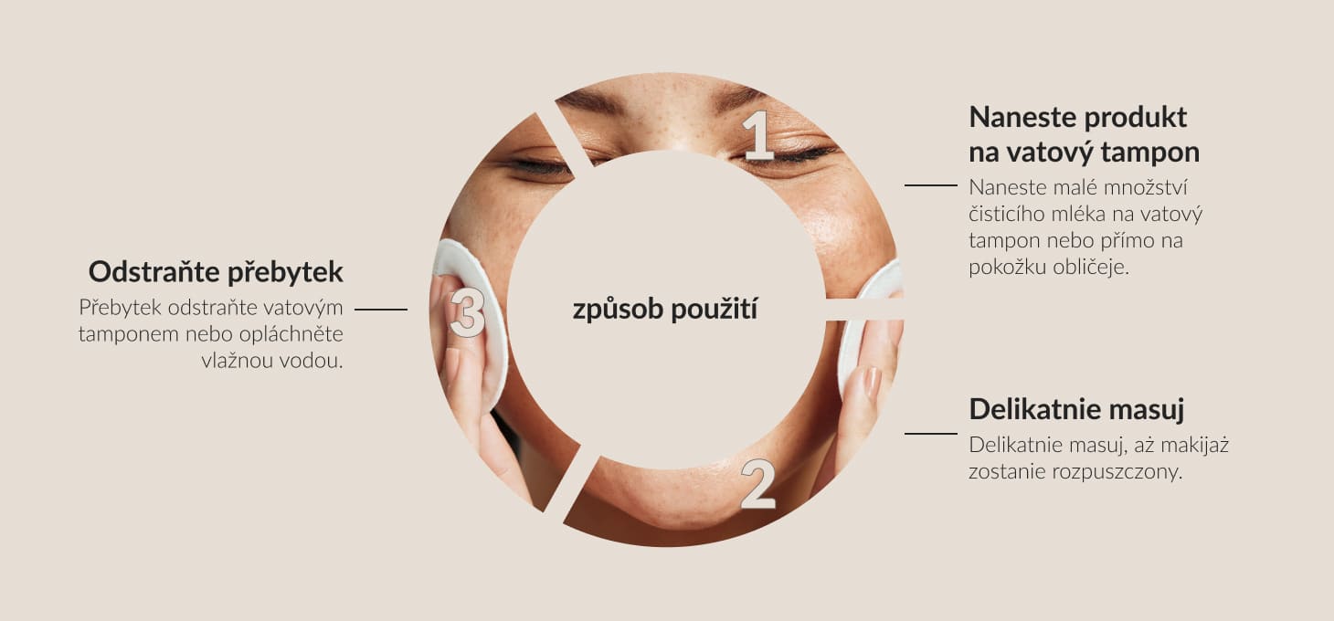 Naneste malé množství pleťové vody na vatový tampon nebo přímo na obličej. Jemně masírujte, dokud se make-up nerozpustí. Přebytečné množství odstraňte vatovým tamponem nebo omyjte vlažnou vodou.