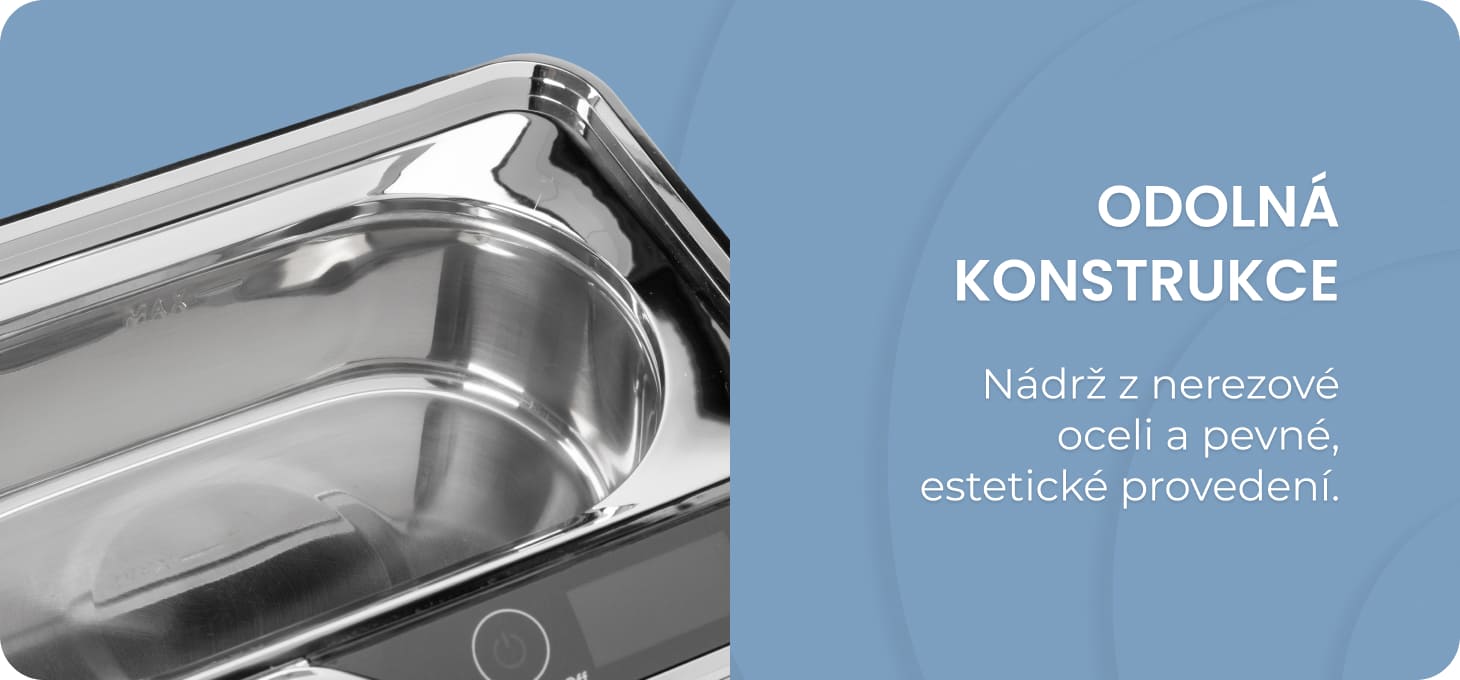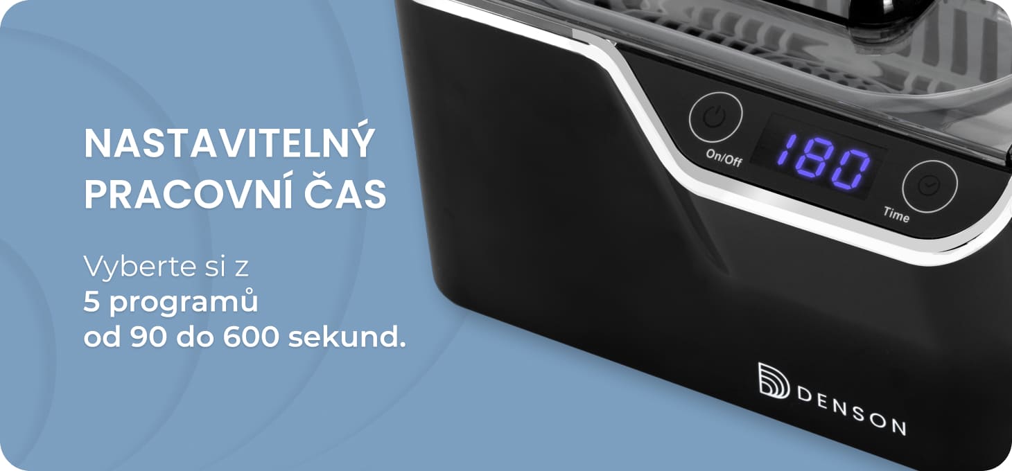Praktický panel s displejem umožňuje zvolit jedno z pěti nastavení doby čištění - 90, 180, 300, 480 nebo 600 sekund - což umožňuje přizpůsobit proces typu a stupni znečištění. Ultrazvuková frekvence 42 kHz zajišťuje důkladné čištění při zachování bezpečnosti choulostivých povrchů. Pro zvýšení účinnosti čištění lze použít dezinfekční kapaliny při zachování koncentrací doporučených výrobci.